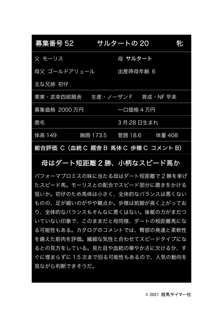 (本レポートはシルクホースクラブの募集馬について、個人的に分析・評価したものです。本レポートの情報によるいかなるトラブル、損失、損害、賠償請求に対しても、その責任を一切負わないものとします。)